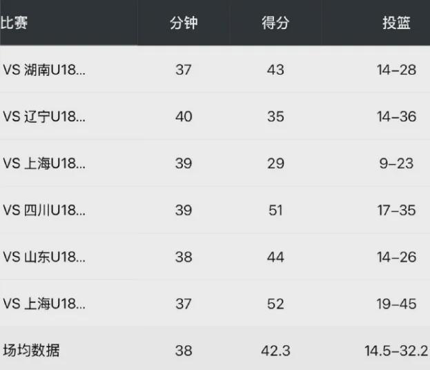 这哥们在过去的U18全运会,场均能够爆砍42.3分外加4.3板4.5助,包括两次单场50+,投篮命中率高达52.3%,展现出了在同年龄段超班乃至降维打击的实力,被认为日后有望成为中国男篮第一得分手。