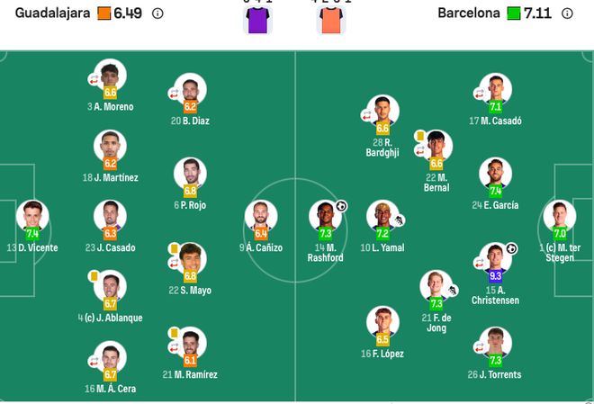 瓜达拉哈拉首发:13-丹尼·文森特、16-塞拉(83’7-内斯克斯)、4-贾维·阿夫兰克、23-卡萨多、18-胡里奥·马丁内斯、21-马努·拉米雷斯(62’8-托诺·卡尔沃)、6-巴勃罗·罗霍、22-塞缪尔·马约、3-奥古斯丁·莫雷诺(62’5-丹尼尔·加拉多)、9-莱克斯·卡尼佐、20-博尔哈·迪亚斯(62’24-萨利福·卡罗皮切)。