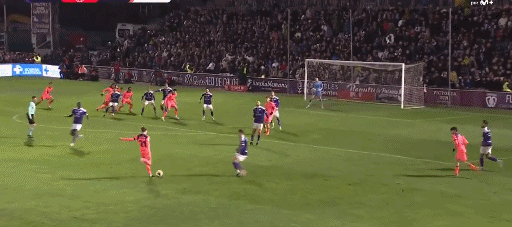 开场仅5分钟,埃里克-加西亚看到对方门将站位过于靠前,半场远距离直接吊门,差点将球打进。