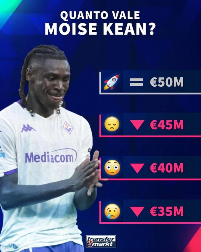 德转将在12月23日更新意甲球员的身价,在莫伊塞-基恩本赛季表现不佳的情况下,德转为这位意大利球星给出的四个身价更新选项分别为维持5000万欧元不变、下跌至4500万欧元、下跌至4000万欧元以及下跌至3500万欧元。